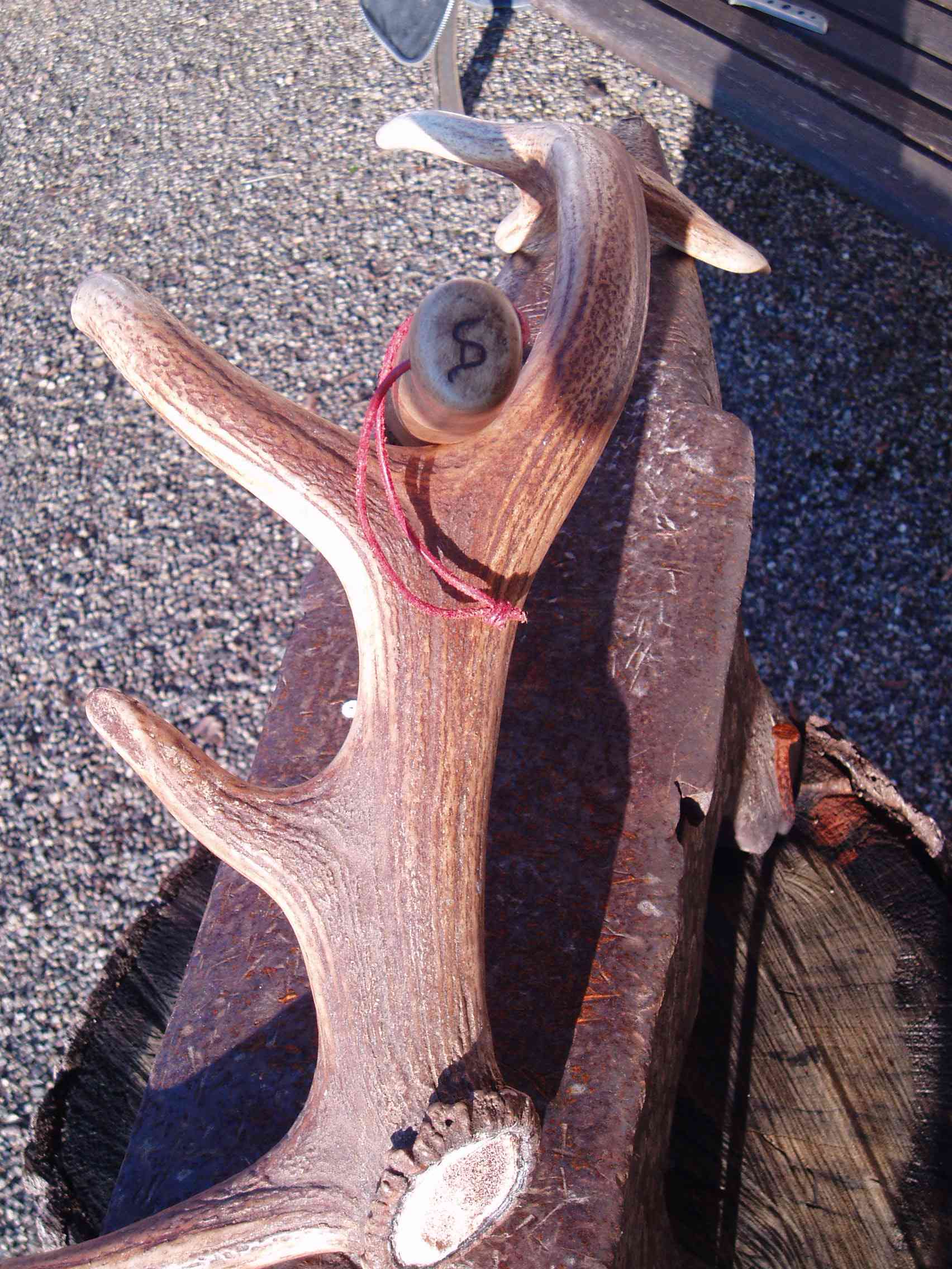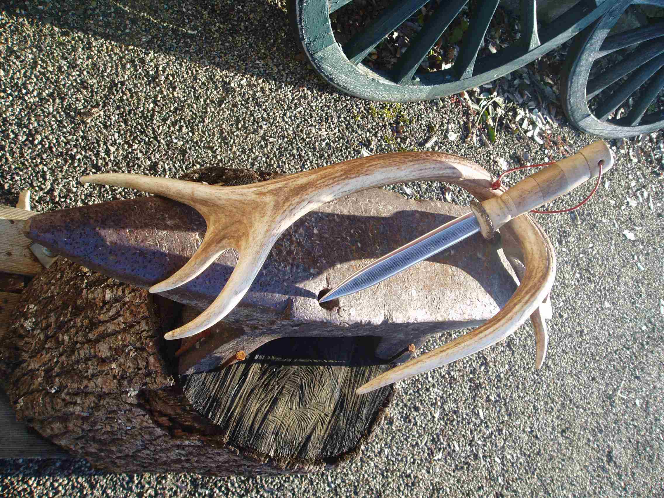 La garde est une couronne de bois de cerf, et le manche est un empilage de tronçons de différents bois (bouleau, olivier, chêne, peuplier, prunier).