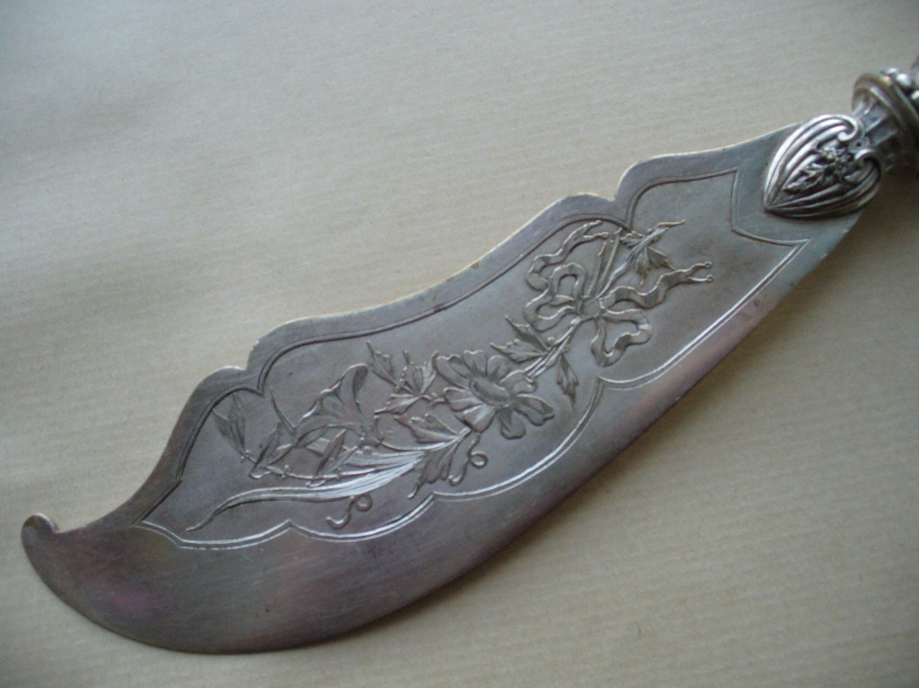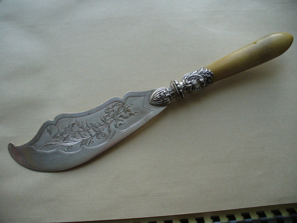 voici un couteau-pelle pour poisson avec manche en corne. A priori, il devrait être en métal argenté, mais je ne trouve pas de poinçon ni de marquage spécifique !