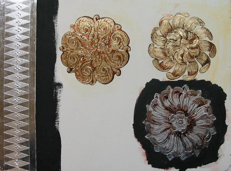 Pour la feuille, ce n'est pas de l'or ; car vendue en carnet de 80X80 mms, et celle-ci est vendue par feuilles de 140X14 : donc pas de la véritable feuille d'or. Mais c'est le résultat qui compte pour le client. Là, c'est pour moi, donc pas grave du tout. Mais si le client me demande une déco flammé comme sur mon essai, il sera bien sûr au courant que ce n'est pas de l'or véritable, et le tarif sera bien sûr en conséquence de son envie. Je ne suis pas là pour "gruger" les gens, mais pour leur donner ce qu'il désire ! (C'est mon principe).