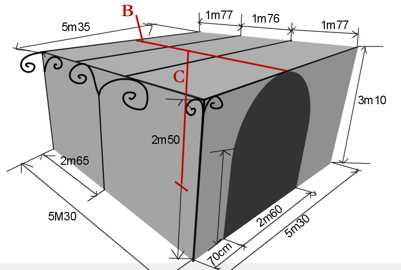 Pour ton indication, j'ai fait chez mes parents une pergola de (si on prend le sens de ton dessin) 5m (profondeur) x 8m (large). Elle est appuyée sur 2 murs (en haut et a droite) et a moitié sur un troisième mur (à gauche).