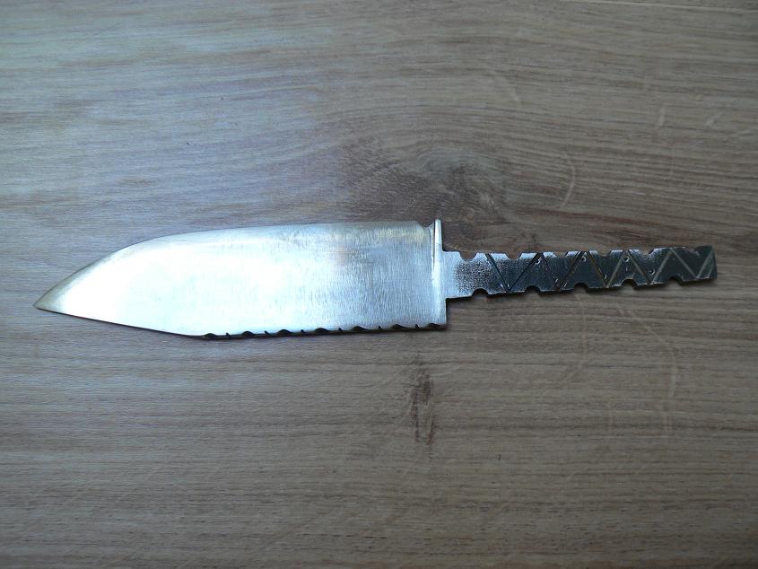 J'ai réalisé mon émouture à la lime ainsi que le guillochage et la soie..., continué par une finition avant trempe à la ponceuse à bande (de parquet !) grains 120, puis à la main avec du papier de grains 240, puis 400 puis 600, puis polissage. Problème : je ne parvenais pas à enlever les rayures trop prononcées sur l'ensemble de la lame.