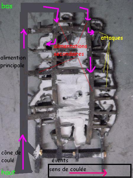 gil a écrit:Ici, vous pouvez voir la fonte brute, telle qu'elle sort du moule en plâtre, oxydée, et encore avec les events, de face.