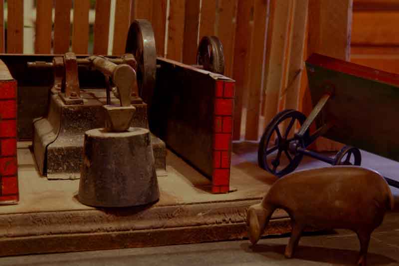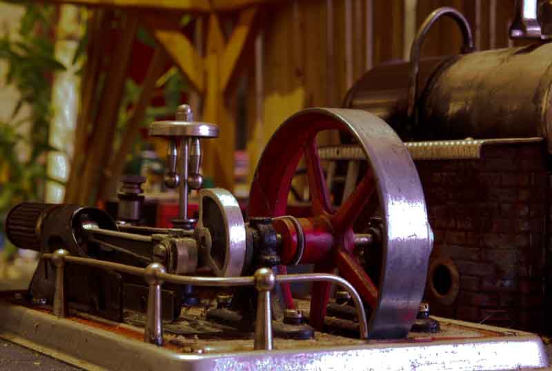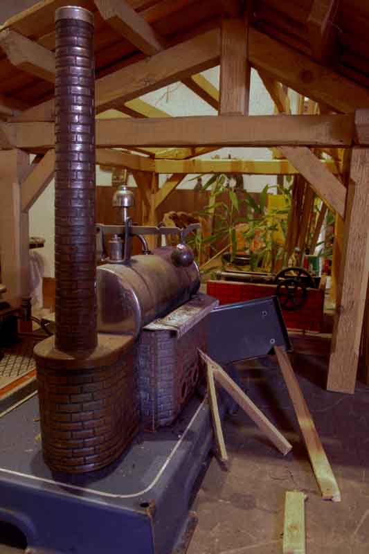 Probablement mue par la force motrice à l'origine, elle fut équipée plus tard par un moteur fixe à vapeur, solution souvent employée dans nos campagnes pour actionner les machines lors des moissons. Il sagit d'un monocylindre en position horizontale.