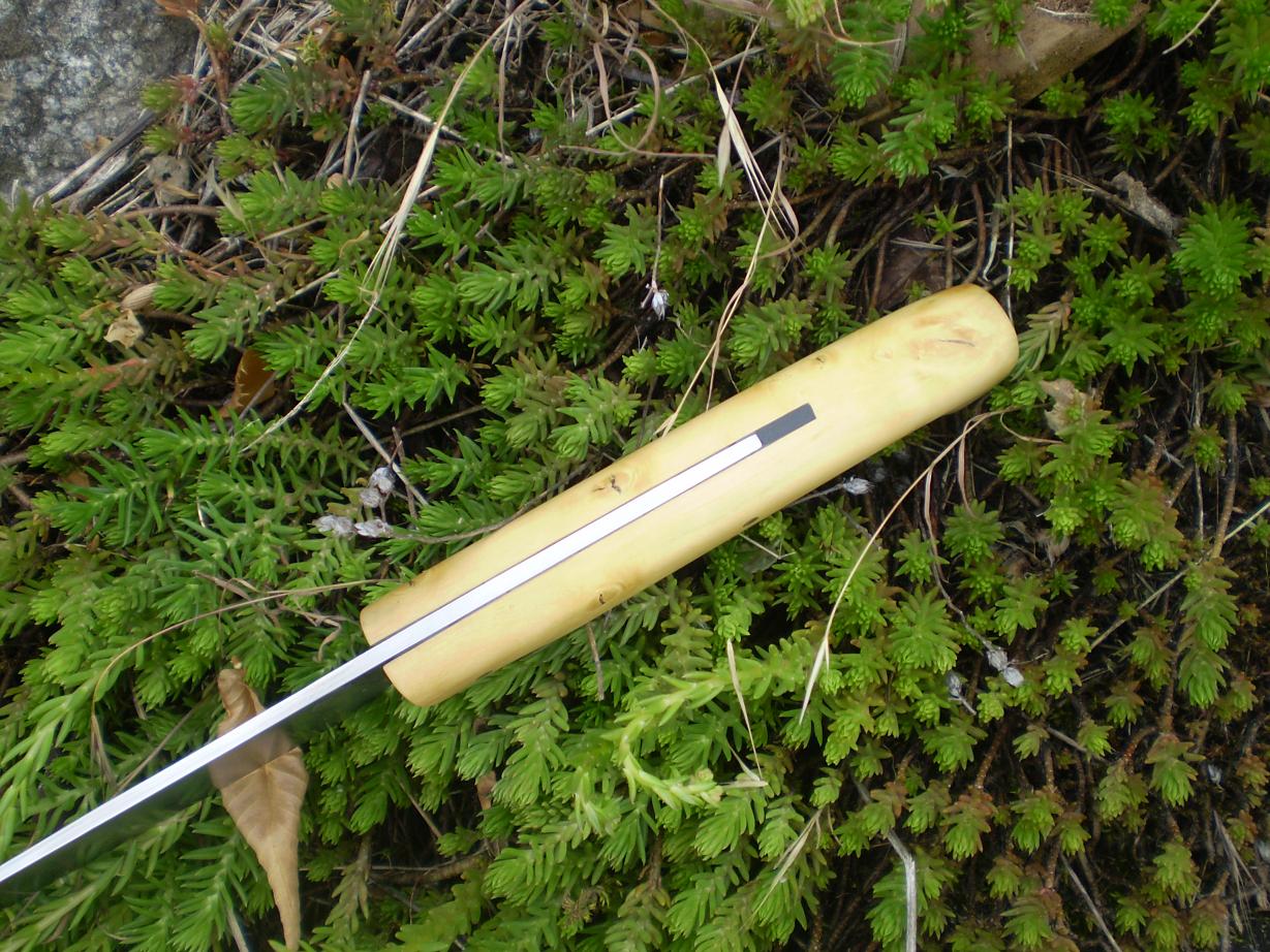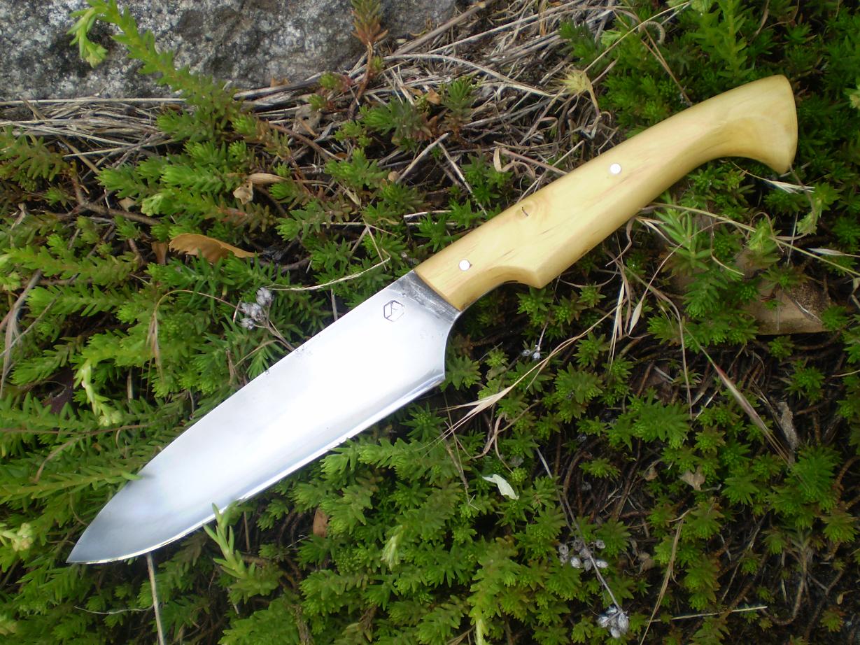 Un couteau droit d'une taille déjà respectable, puisqu'il mesure 28cm hors tout pour 15cm de tranchant. La lame est forgée dans du 100C6 et à reçu une trempe sélective à l'américaine dans le goop. Le manche en buis accueille la lame grâce à un montage en demi plate semelle, traversé par deux rivets. De plus, le tout est assuré par un collage à l'époxy.