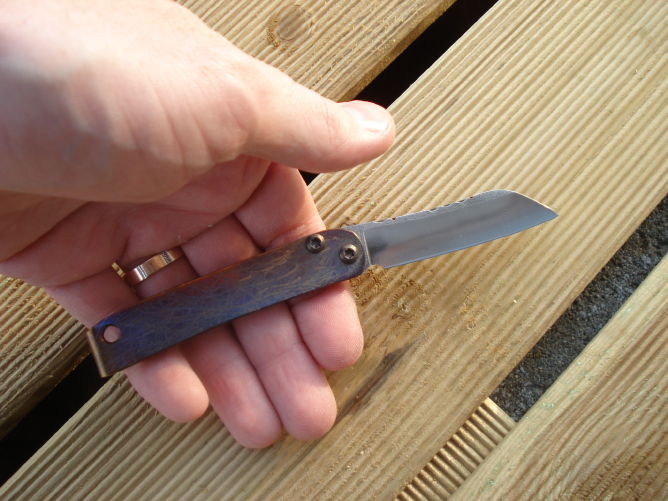 Le manche est en inox plié comme les vieux higonokami, traité comme le fait kof (j'avais dit que je copierais ce type de texture sur le manche) et chauffé au flambart. La visserie en inox est traitée de la même manière.
