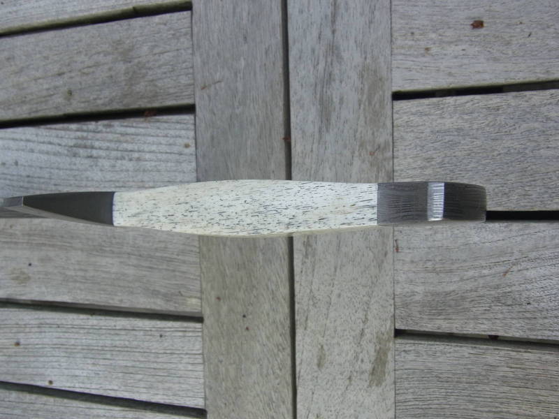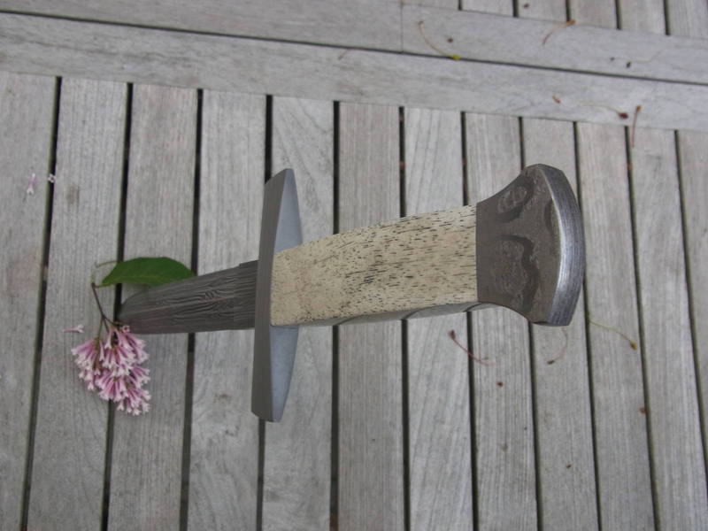 Olivier21 a écrit:Superbe ! Sur la dernière photo, on dirait qu'il y a un reflet sur le petit côté du manche, comme s'il était poli, une épaisse plate semelle avec un fin insert d'os. Mais la plate semelle serait trop large par rapport au manche. Ou est-ce un dessin du Damas ? En même temps, le pommeau a l'air vissé, car il n'y a pas de trace de matage ou alors très discret!