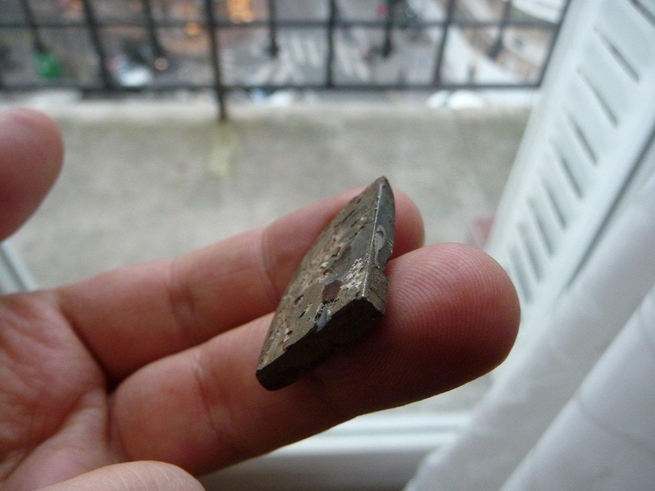 Il pèse 32 grammes, et a une couleur grise avec des reflets jaunes. Il a été testé à la pierre de touche et n'a pas révélé la présence d'or mais à l'endroit où il a été frotté, une couleur jaune brillante est apparue. Son volume est de 2cm cube (plongé dans un tube de seringue gradué, le volume d'eau a augmenté de 2ml), et est donc plutôt dense ! Densité supérieure à 15 donc. Si l'on approche un aimant, il colle.