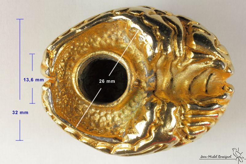 Le métal est gris et est recouvert d'une couche dorée (de l'or ?) très brillante aux endroits soumis à frottement et terne pour le reste, ce qui accentue le relief.