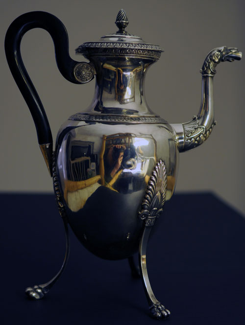 Il s'agit d'une verseuse tripode en argent 950/1000ème d'un poids de 429 grammes et 23,5 centimètres de haut. Cette verseuse repose sur trois pieds terminés en pattes griffes à attaches à décor de feuilles de laurier. Elle est ornée d'une frise feuillagée, d'un bec à tête de chien et d'une pomme de pin sur le couvercle (prise du couvercle bouton), d'un manche en bois noir à double attache. Présence sur le devant d'un monogramme "CBS".