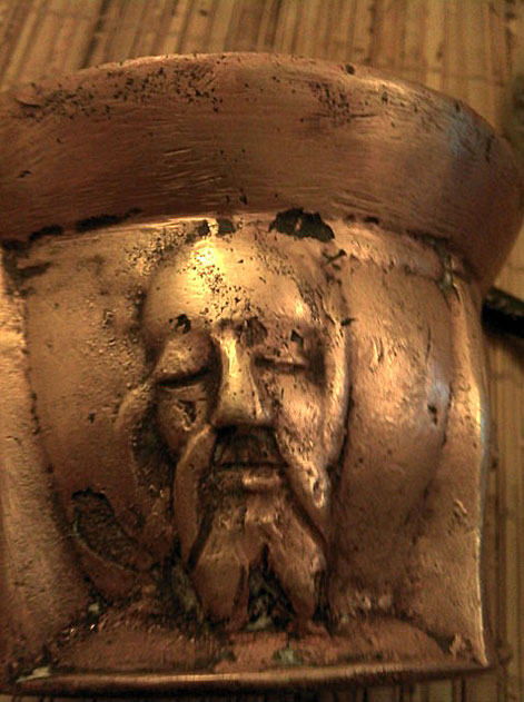 Il a 4 faces avec des têtes d'homme barbu avec les yeux fermés (plus ou moins différentes les unes des autres).