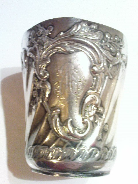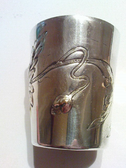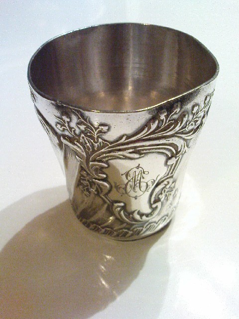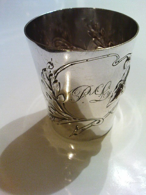 - une timbale (dite n°1) style art nouveau, pesant 94gr qui porte 2 poinçons : rectangle "1er titre", et oblong "ES" ou "LS" :