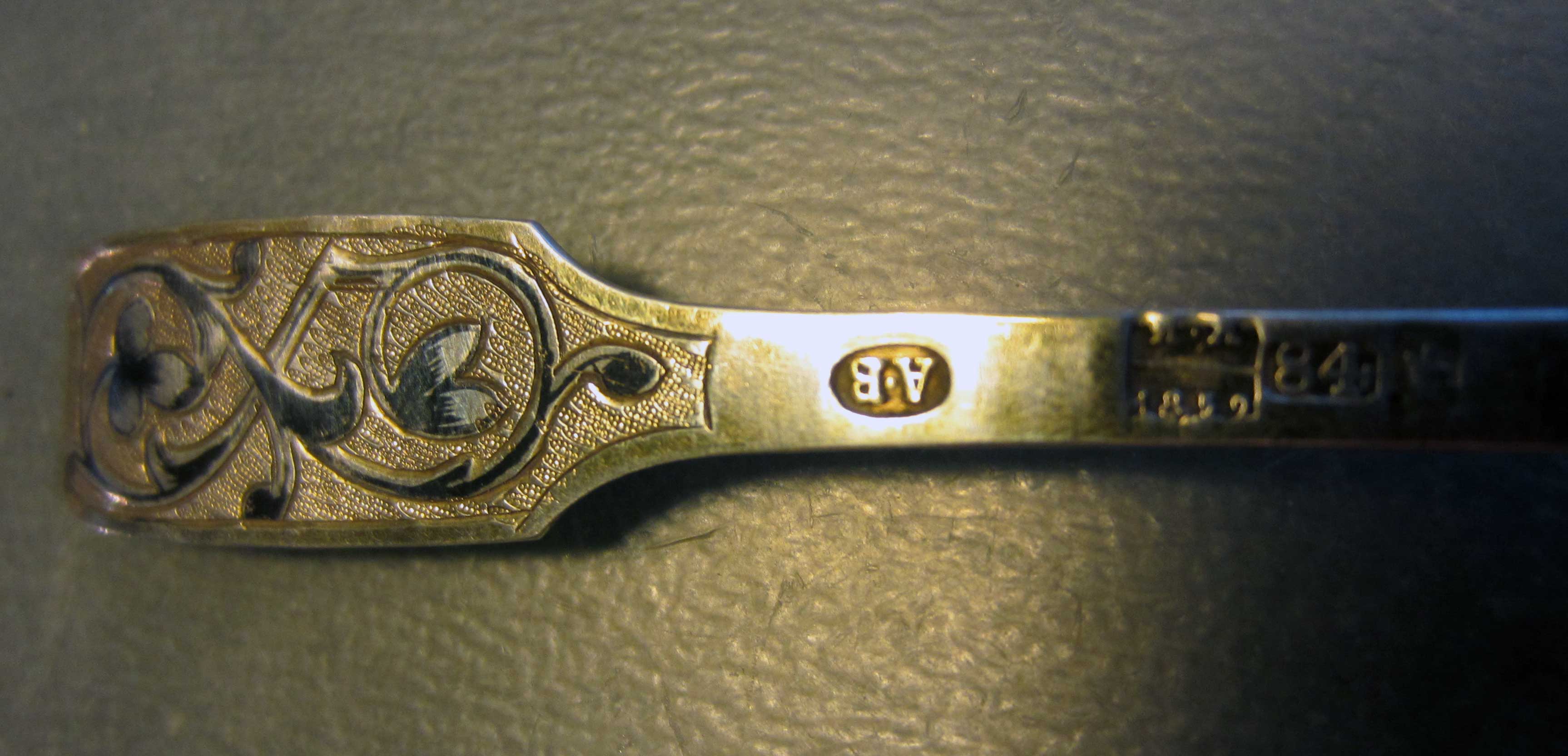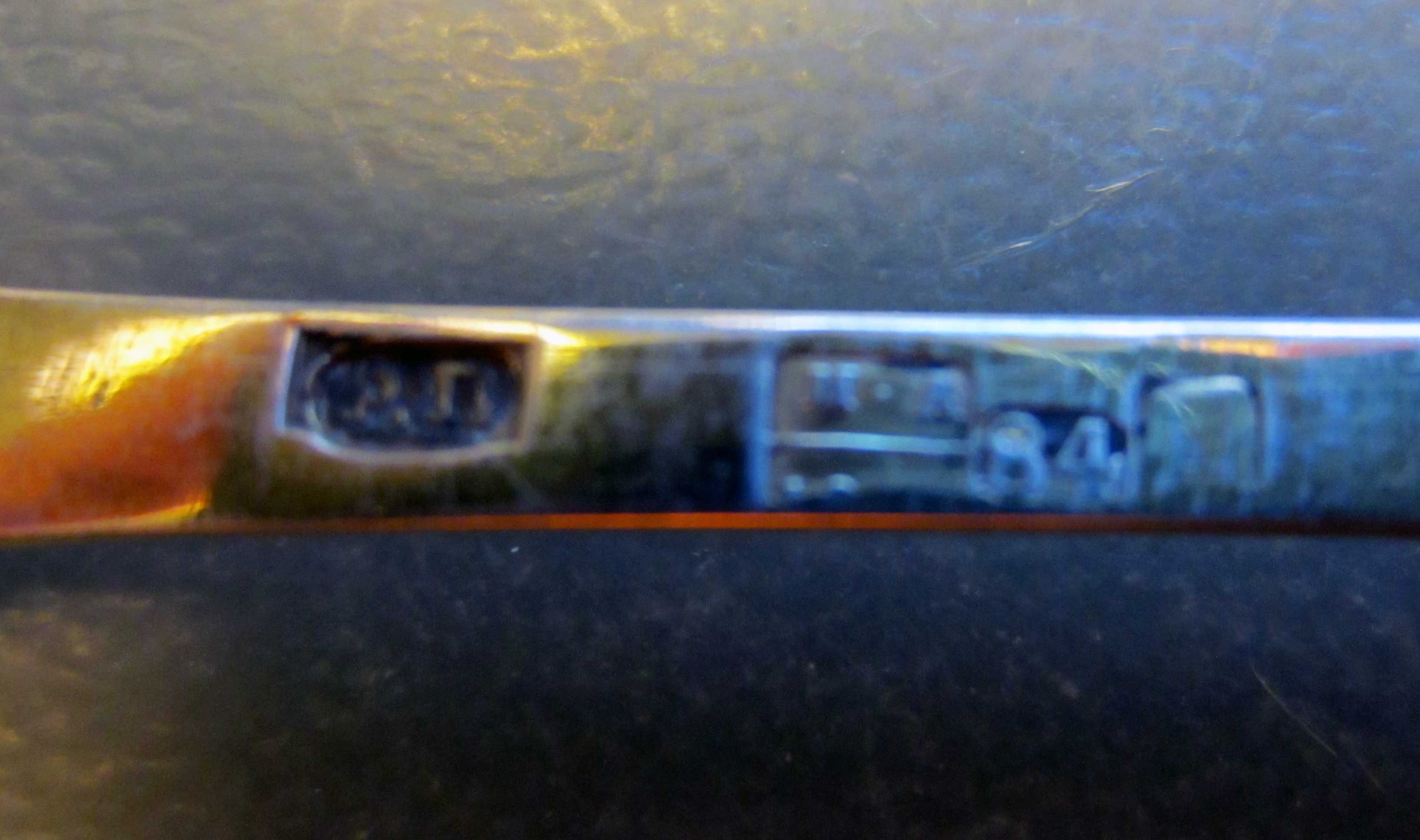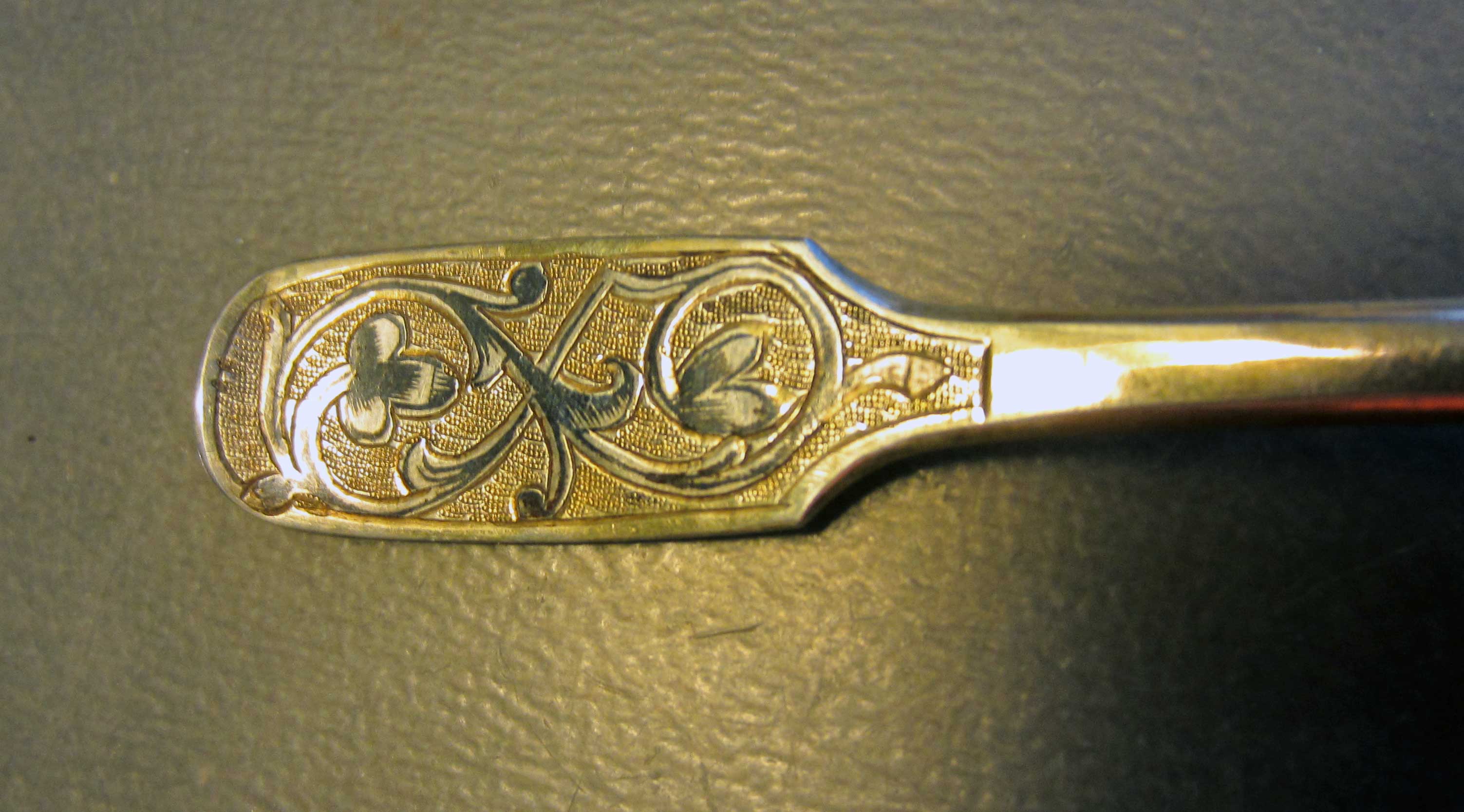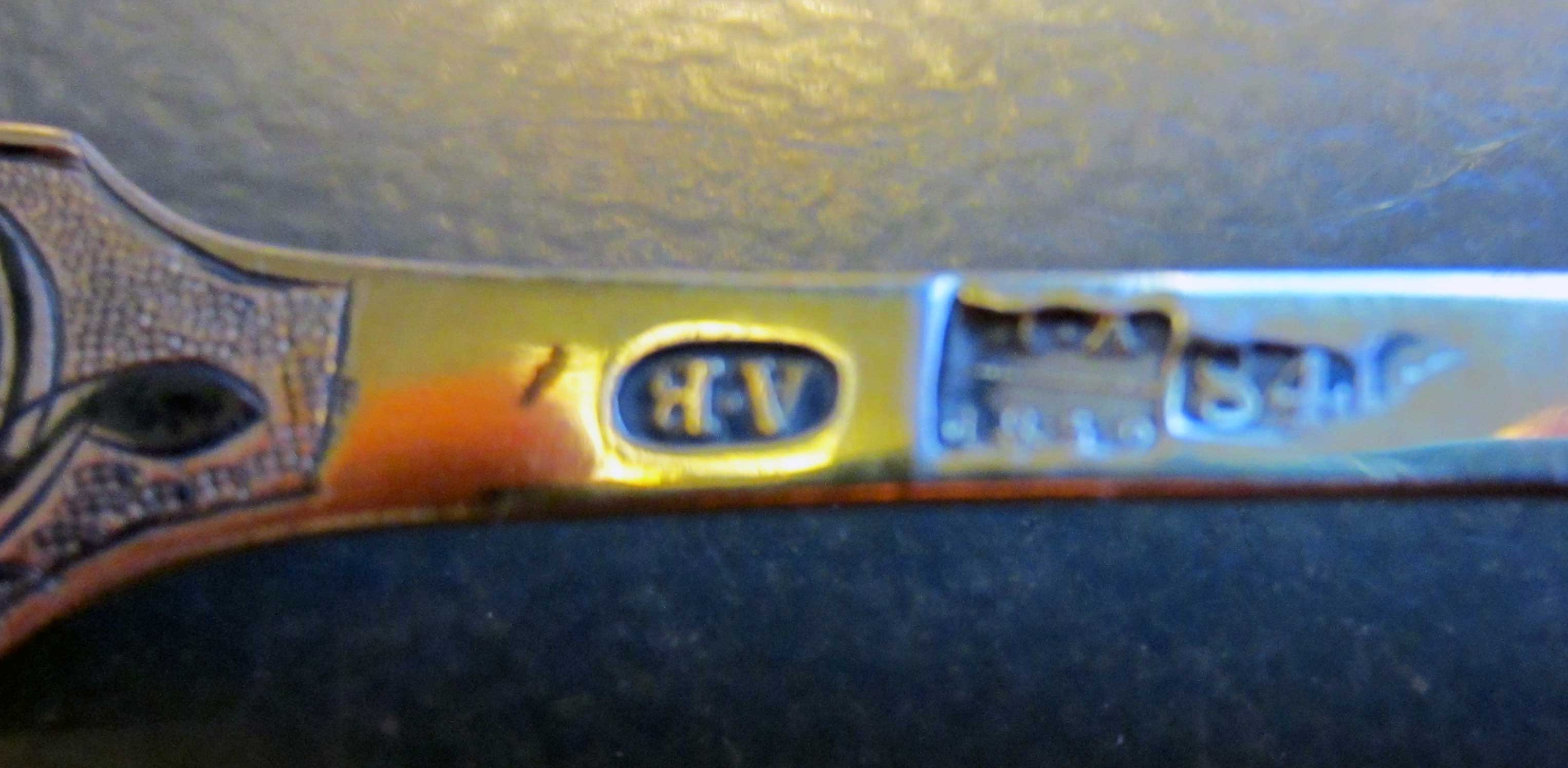 2/ les lettres H.A ou N.A (difficile à discerner), qui doivent être du cyrillique si j'ai bien compris les interprétations avec juste en dessous la date 1859 (sur 5 cuillères) ou 1860 (sur 1 cuillère) ;