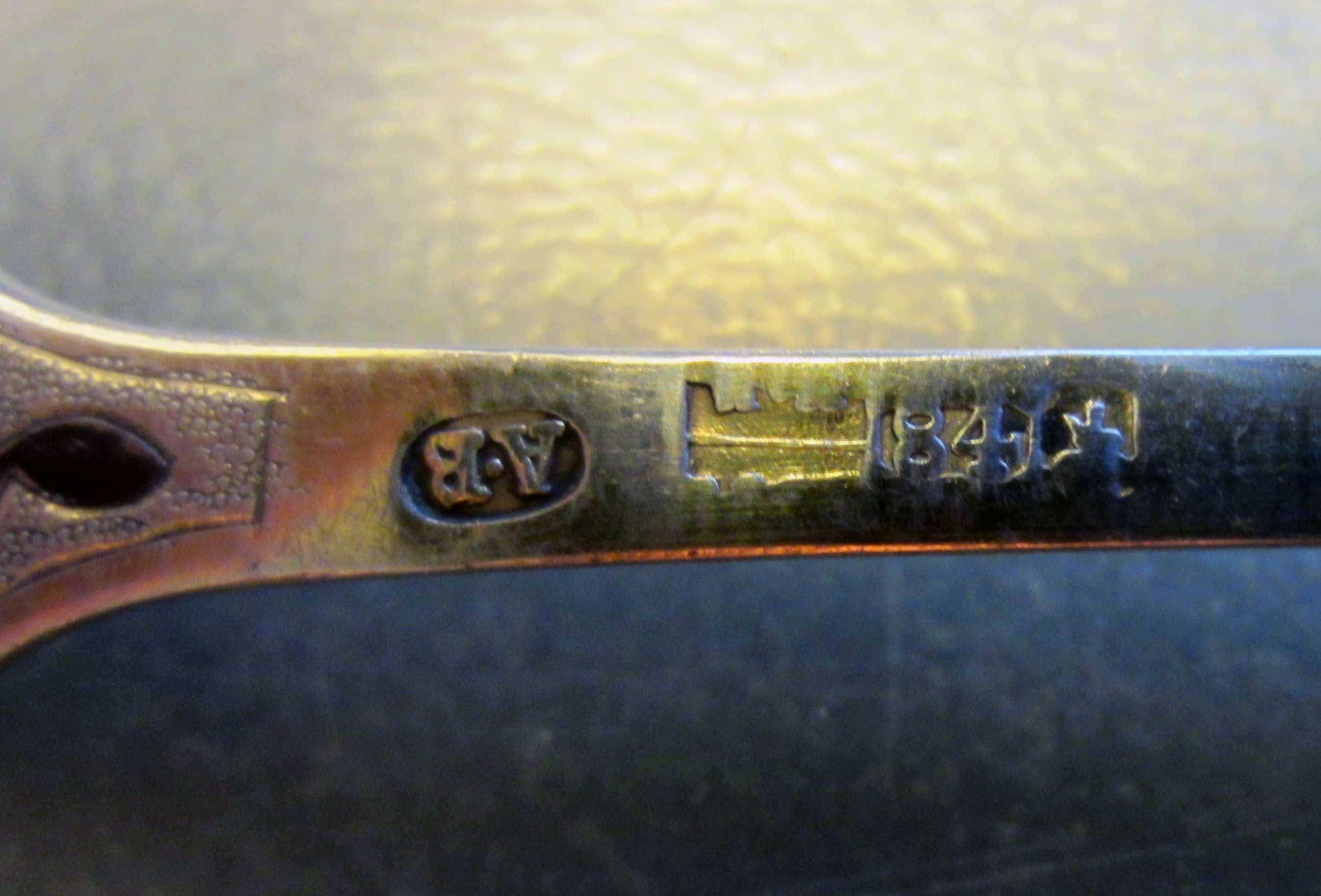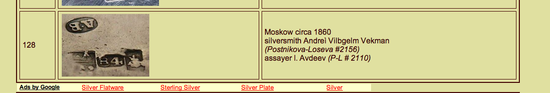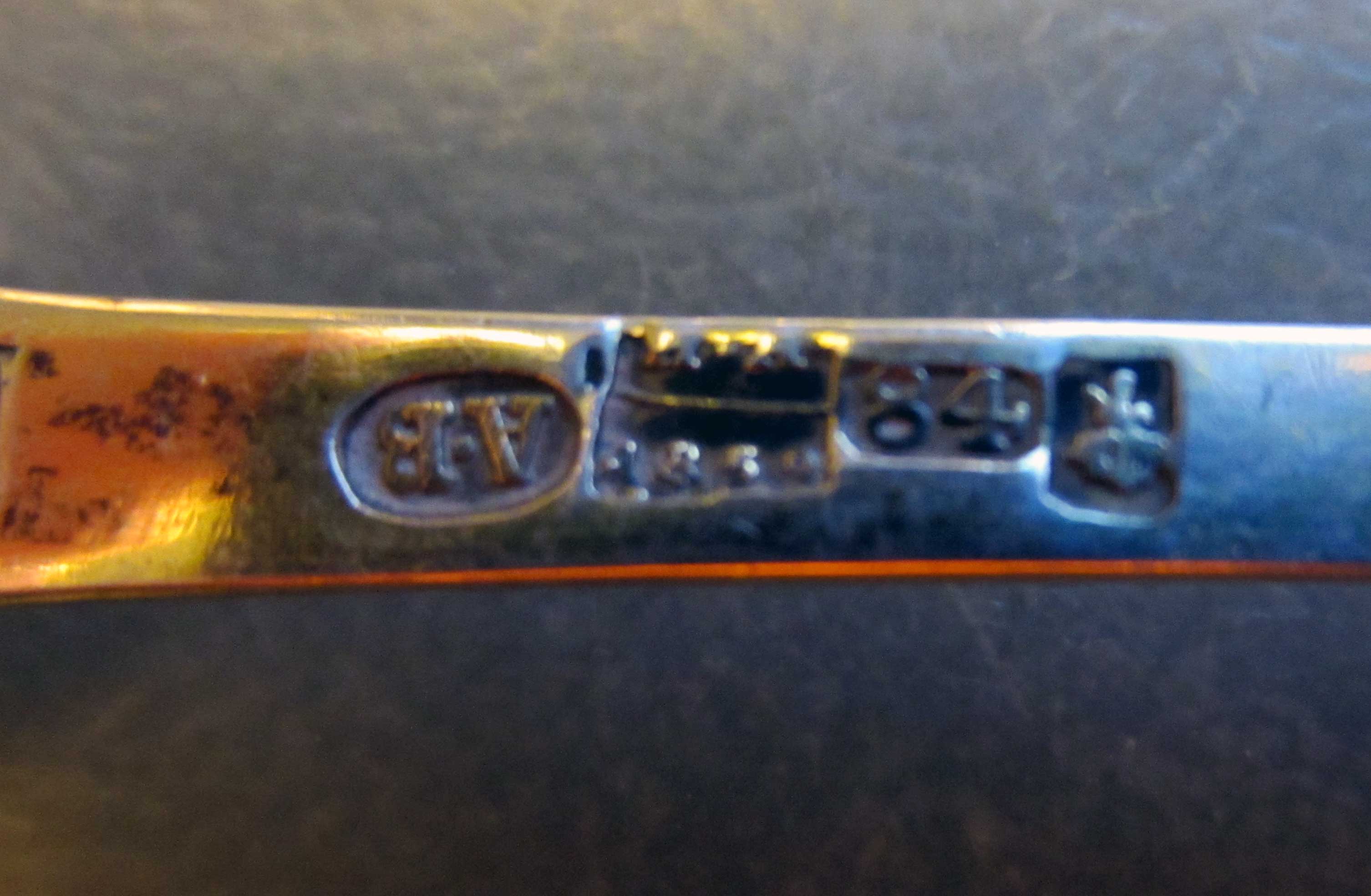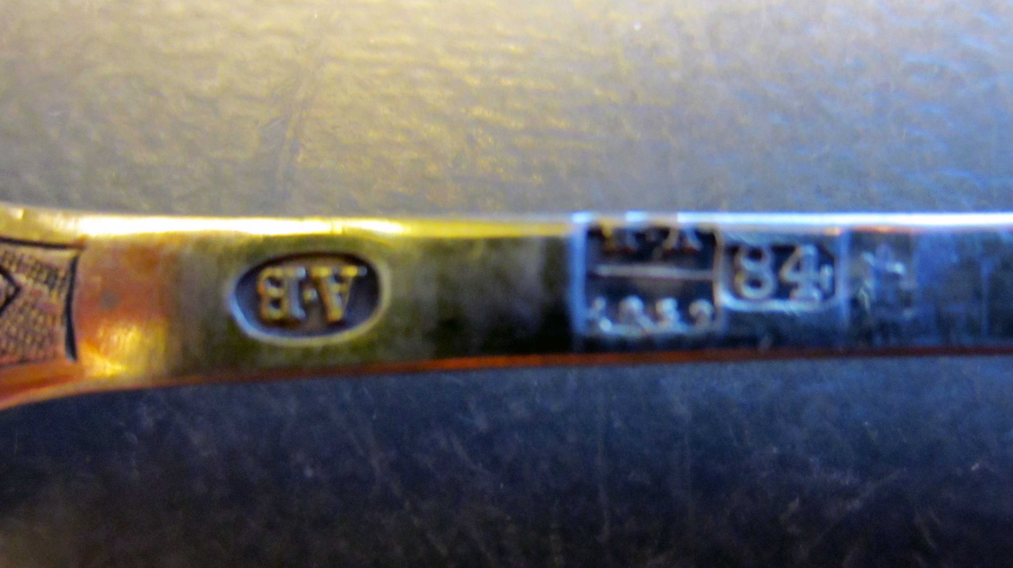 2/ les lettres H.A ou N.A (difficile à discerner), qui doivent être du cyrillique si j'ai bien compris les interprétations avec juste en dessous la date 1859 (sur 5 cuillères) ou 1860 (sur 1 cuillère) ;