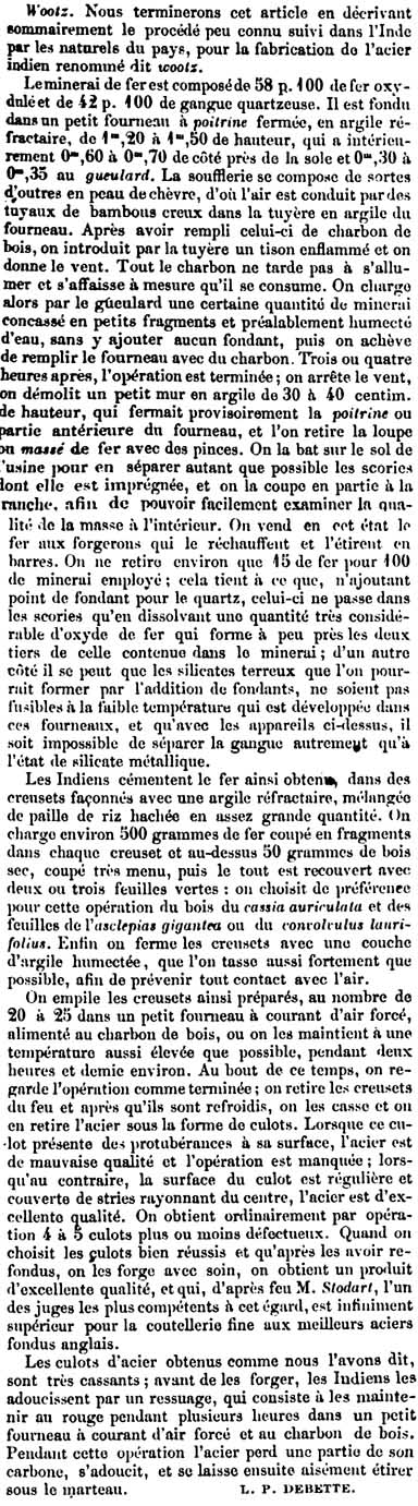La technique de fabrication du wootz, telle qu'elle est rapportée dans le "Dictionnaire des arts et manufactures" (1845).