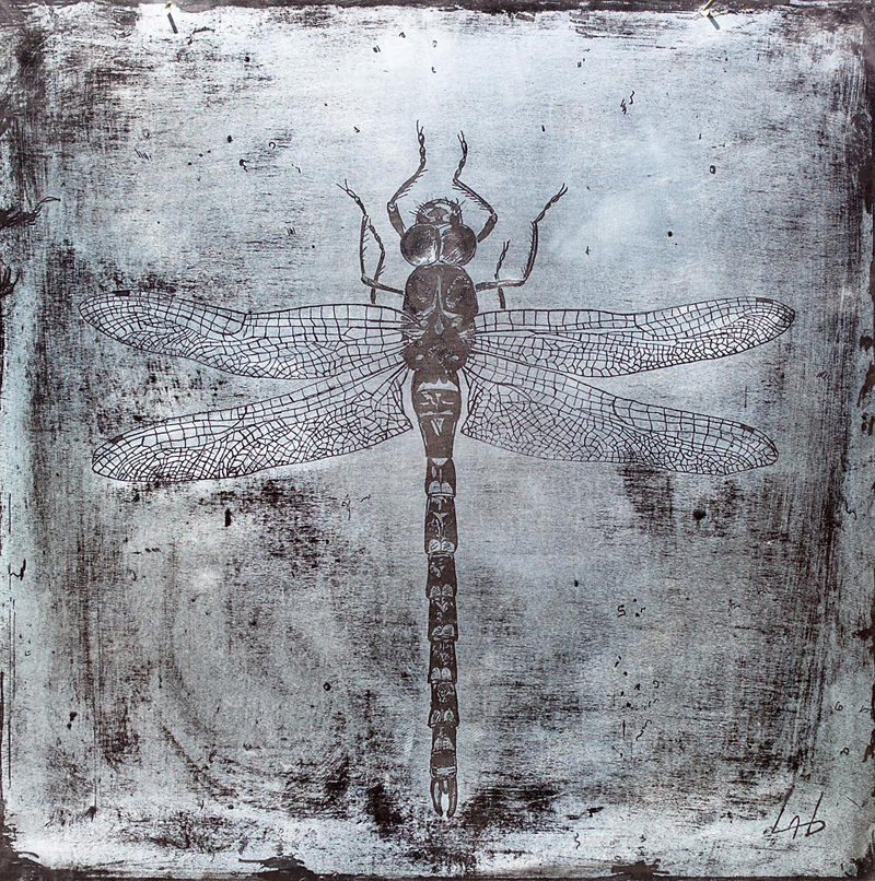 L’insecte est alors esquissé à l’encre sur ce support et servira de repère à un outil qui se chargera ensuite d’éliminer le vernis à certains endroits.