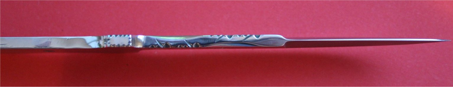 Révélation de la ligne de trempe au perchlorure de fer ; la finition est patinée à la laine d'acier, le tranchant à été re-poli.