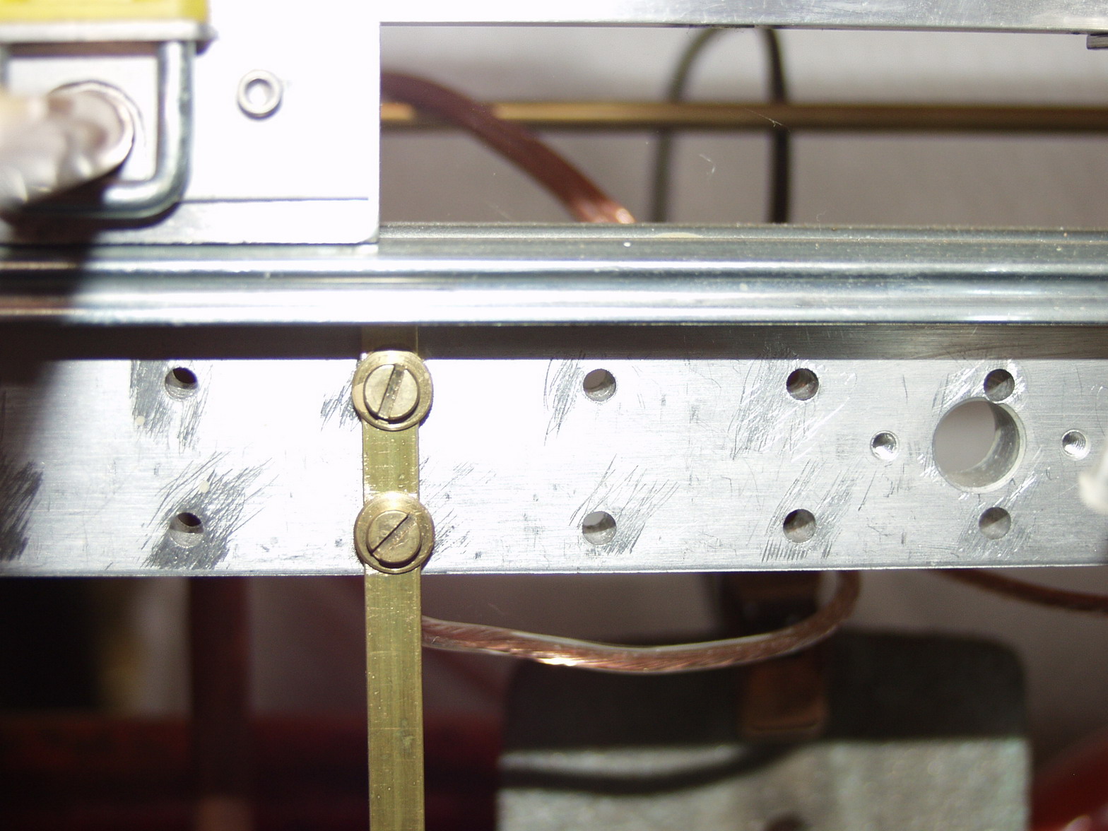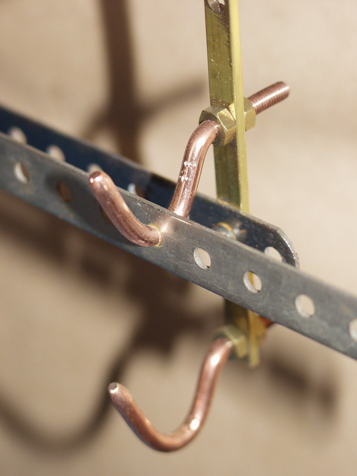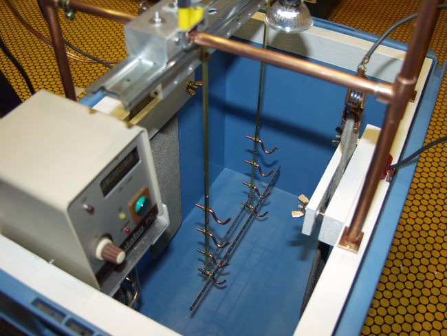 -Les supports de pièces à traiter sont tout simplement fabriqués à partir de barres laiton et de crochets en cuivre de 4mm de diamètre, section des trous Meccano. Le cuivre est plus facile à courber. Bien sûr j'ai adapter l'écartement des barres verticales au pas du système Meccano. Je peux également déplacer les barres verticales pour adapter le système d'accrochage en fonction de la longueur des pièces. J'ai conçu l'espace d'accrochage des pièces pour respecter une autre paramètre trouver dans le bibliographie ancienne: les pièces à traiter doivent être situées dans la zone du tiers médian de la hauteur du liquide du bain Il ne faut pas être dans les tiers inférieurs et supérieurs pour plusieurs raisons, les courants ne sont pas homogènes et en partie basse, on peut être gêné par la présence de "boues".