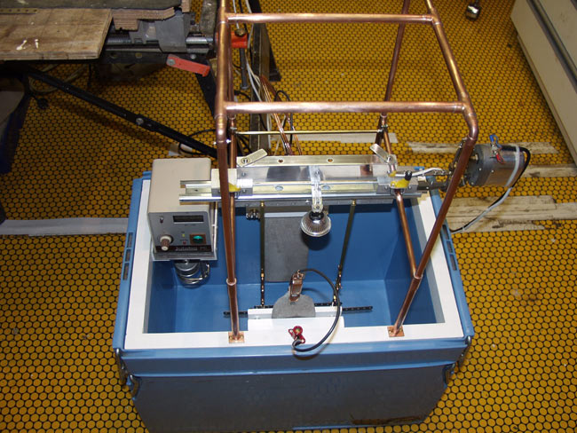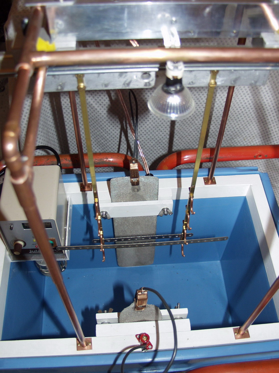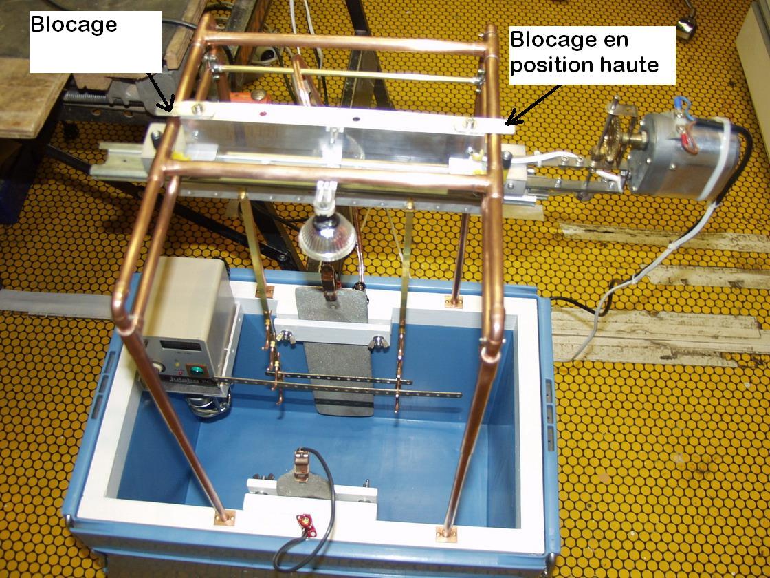 Ce bac a d'excellentes qualités isothermes puisqu'une heure après l'arrêt du réchauffage, la température du bain ne chute que d'1°C. Ce qui me permet de retirer le réchauffeur pendant la phase d'électrodéposition. Je pense procéder de la sorte pour éviter de mettre en suspension les particules solubles puisque je n'ai pas prévu de système de filtration (certainement un sujet de discussion). Pour éviter ce phénomène et celui de formation de dégagement gazeux (bulle) à la surface des pièces à traiter (nuisible à la qualité du dépôt), j'ai construit un système d'agitation mécanique.