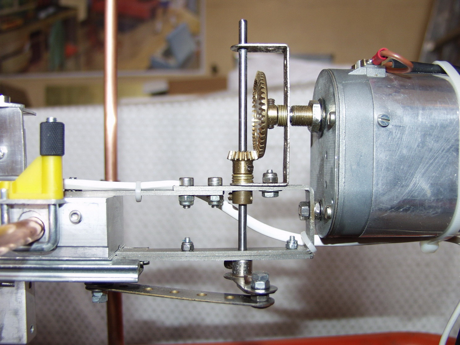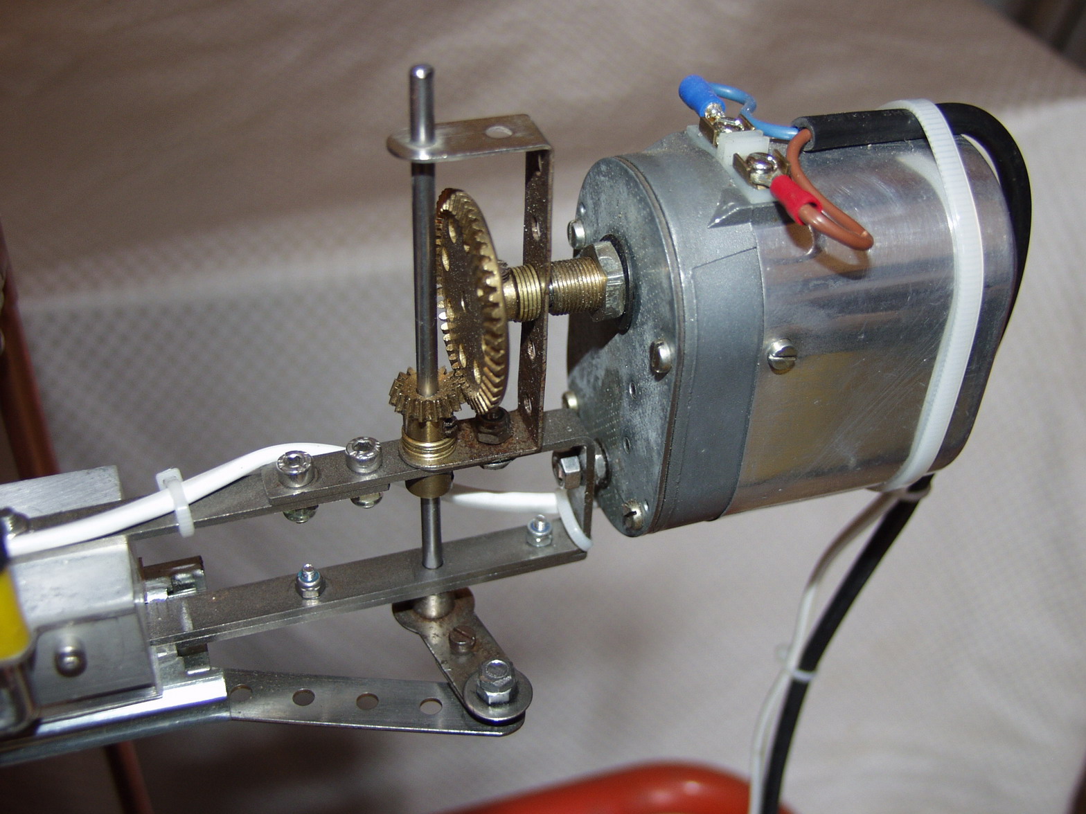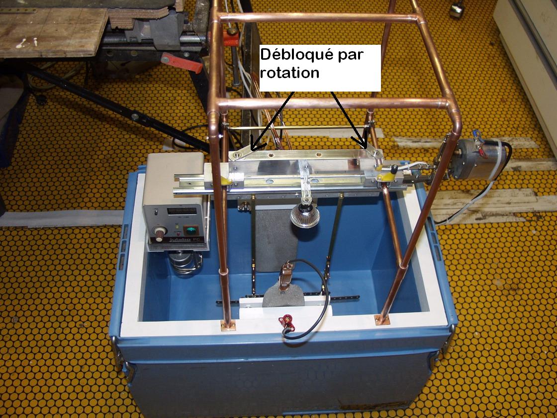 -Le système d'agitation mécanique des pièces à traiter, la vitesse optimale de la barre cathodique retrouvée dans la bibliographie est de 5 à 6mètres/mn. J'ai construit le système avec des pièces Meccano, bielle, engrenages coniques à nombre de dents différents pour adapter la vitesse de rotation de la bielle par rapport à celle du moteur électrique (moteur moderne en basse tension). L'alimentation électrique du moteur permet également de faire varier la vitesse du moteur (ceci n'est pas nécessaire, mais je l'avais). La bielle permet de provoquer un va et vient de la barre cathodique supportant les pièces. Pour améliorer le guidage et réduire la résistance mécanique du mouvement de va et vient, la barre cathodique a été fixée sur la partie mobile d'un système de coulisse de tiroir (système à bille). l'ensemble a été testé pendant de longues heures, il est fiable et très silencieux. Le moteur et le réducteur de vitesse sont visibles sur la droite