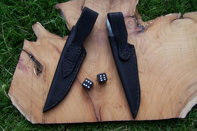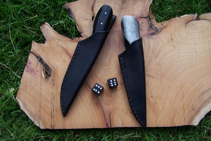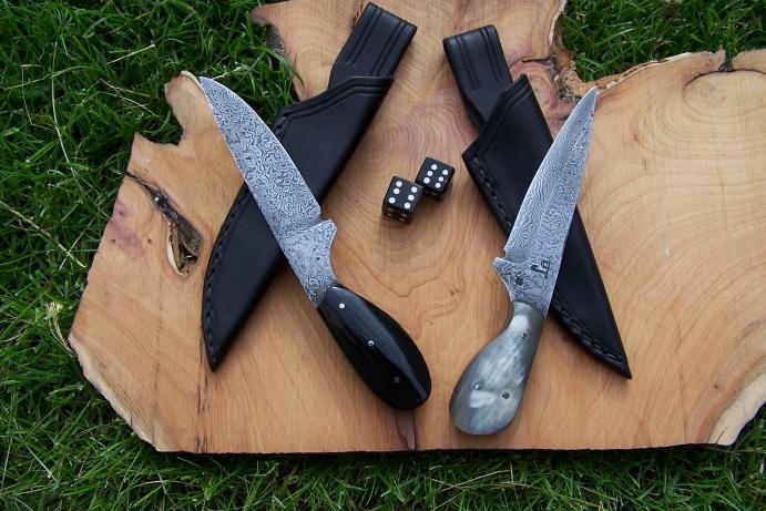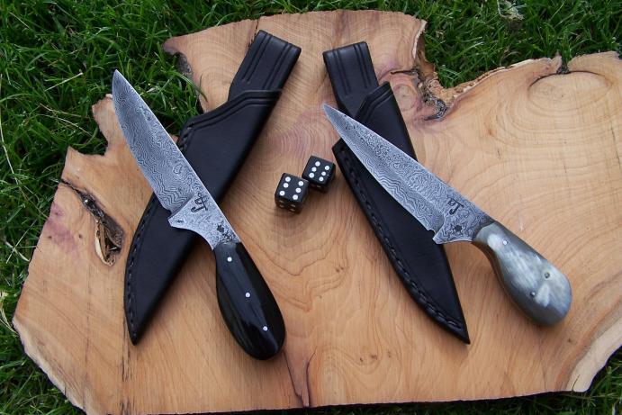Superbe duo, j'aime beaucoup l'idée du contraste de couleur des manches. De plus, l'association de ces deux aciers offre un beau contraste, c'est intéressant quand on veut avoir un damas qui se voit bien.