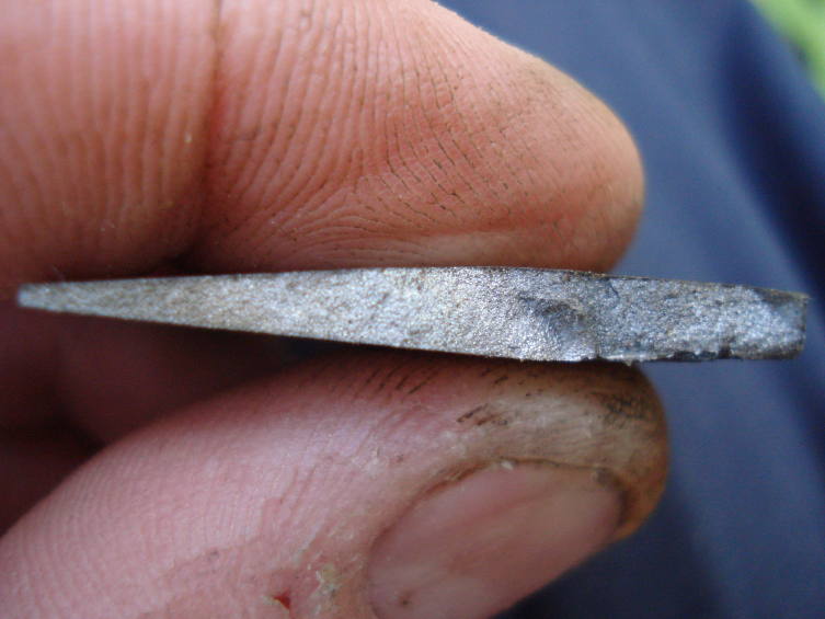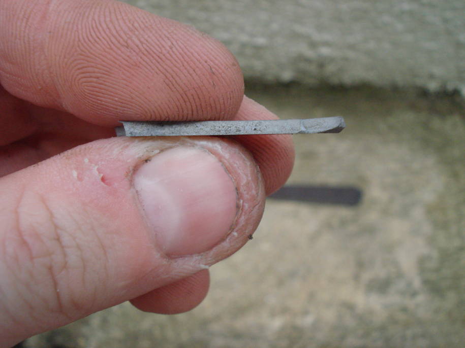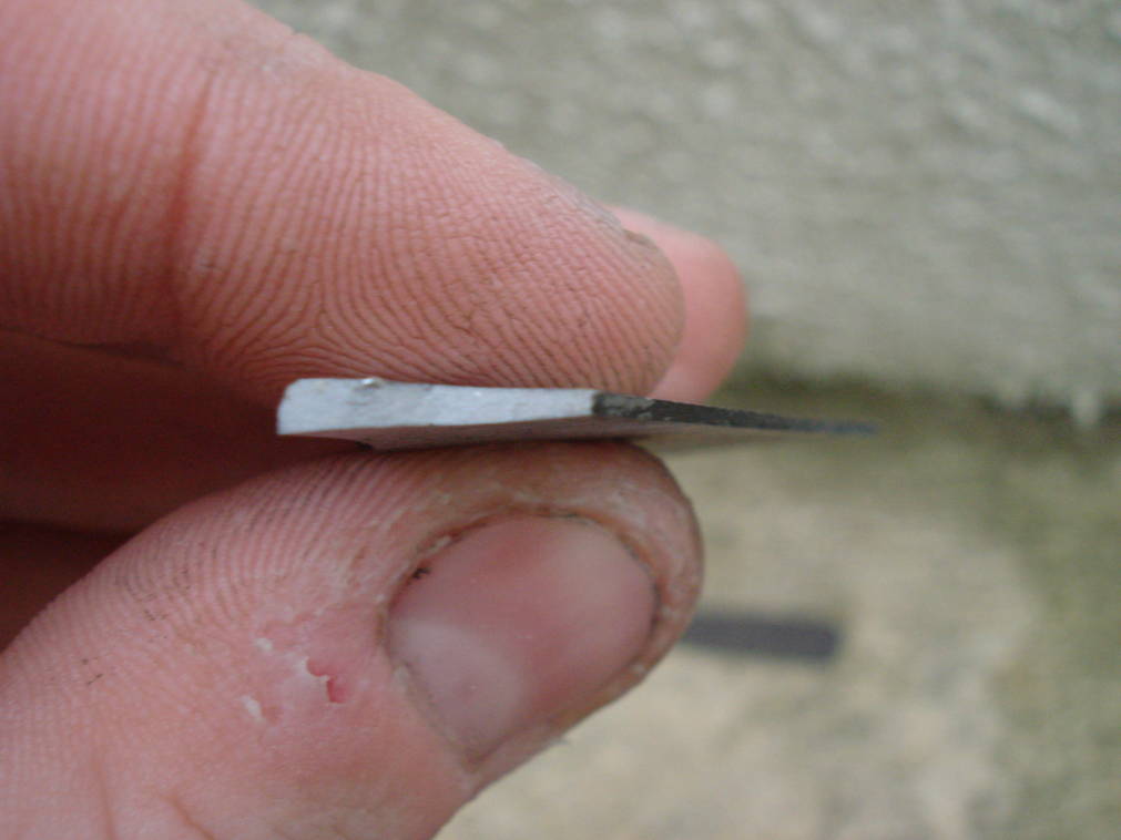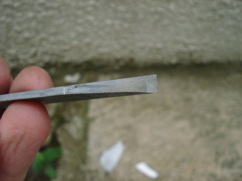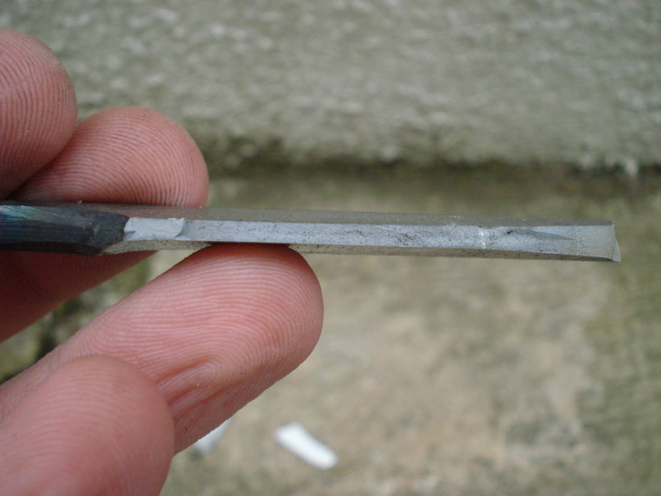 Le problème se situe dans le fait que 1cm du tranchant, en plein milieu de la lame, n'est pas trempé. Bon, je me suis douté qu'il devait s'agir d'une température trop basse de trempe, sûrement due à une mauvaise répartition de la chaleur sur la lame... Mais je suis pas sûr et de plus, après révélation de la trempe sélective au perchlorure de fer, j'ai observé un curieux motif sur la ligne de trempe.