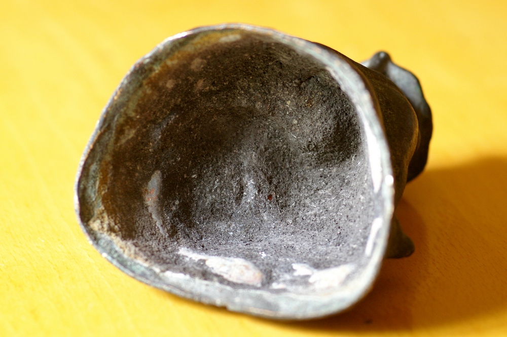 La pièce est creuse sur pratiquement la moitié, elle était remplie d'une terre noire très compacte et très résistante. Je pense qu'il est très difficile de dater ce genre de trouvaille, mais si quelqu'un pouvait situer sa provenance et si il s'agit bien de bronze...