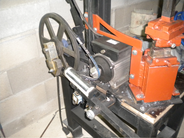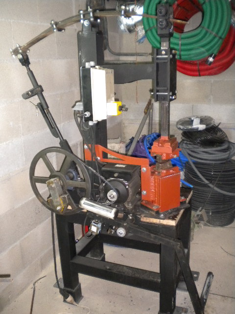 Il se démonte entièrement pour rentrer dans mon petit véhicule. Le moteur est un 2cv en mono, le pilon se met en marche grâce à un interrupteur placé vers le galet tendeur qui commande par la suite le contacteur de puissance.