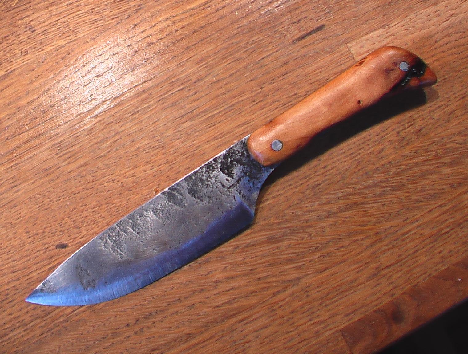 Il s'agit d'un couteau forgé en hitachi blue steel. En fait, c'est surtout la lame qui est forgée (l'émouture, notamment) ; j'ai un peu triché pour le manche.