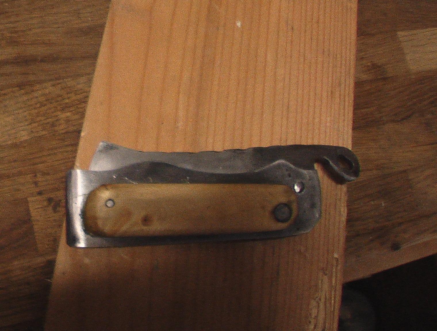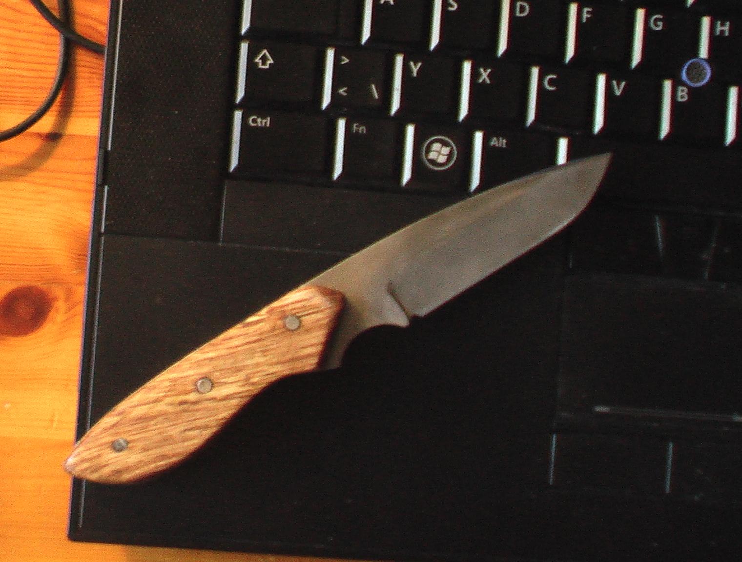 Tout d'abord, mon tout premier couteau, très grossier, mais surtout pour essayer, fait dans une lime (trempe huile, revenu chalumeau) :