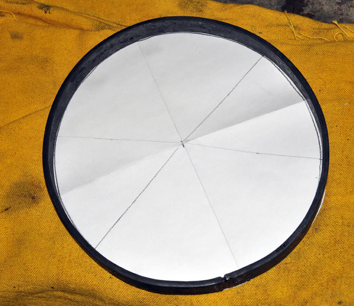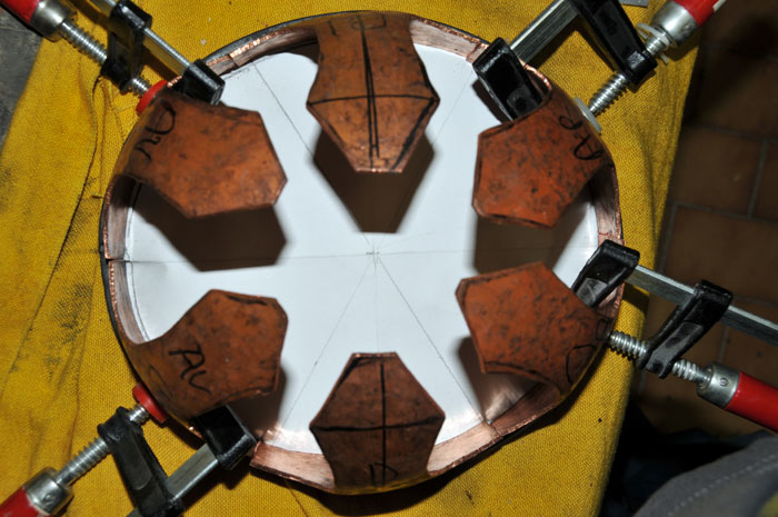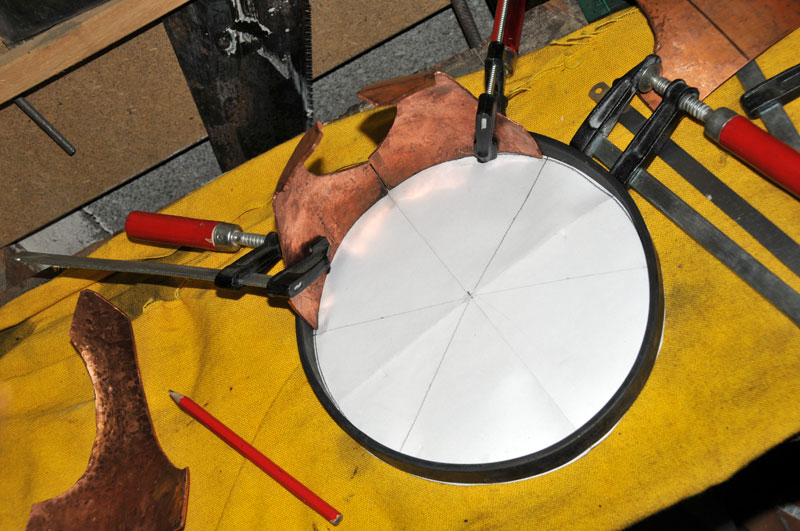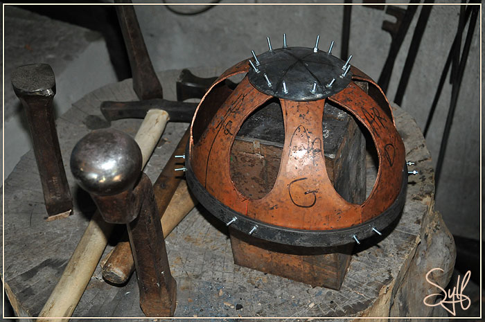 Il faut donc forger dans un premier temps les 6 triangles des panneaux, ainsi que le "sommet" du casque, un cercle bombé qui va permettre de rassembler les 6 panneaux...