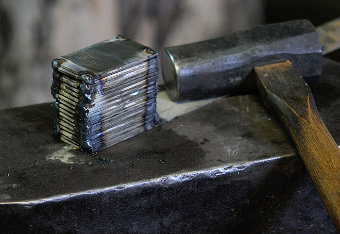 Dans un deuxième temps, je prépare du damas, beaucoup de damas. Les tôles de damas au final feront dans les 2mm d'épaisseur environ, je m'arrêterai donc aux alentours de 100 couches, ce qui donnera un dessin assez fin, assez torturé (car forgé très prés des côtes finales).