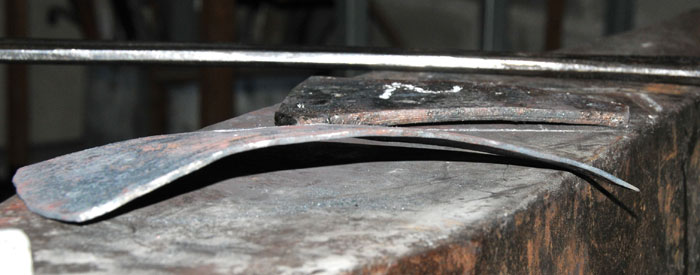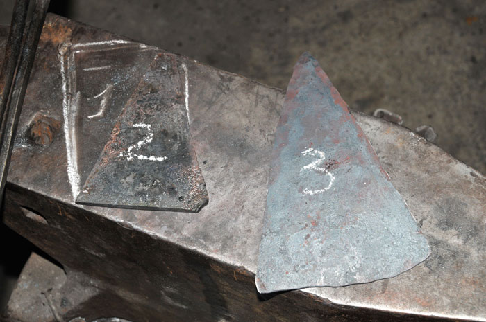 Il ne faut pas trop étirer, car il me faut pas mal de largeur, donc lorsque j'ai un grand rectangle mais encore de l'épaisseur, je coupe en suivant la diagonale pour ensuite forger au marteau les panneaux triangulaires jusqu'à environ 2,5mm.