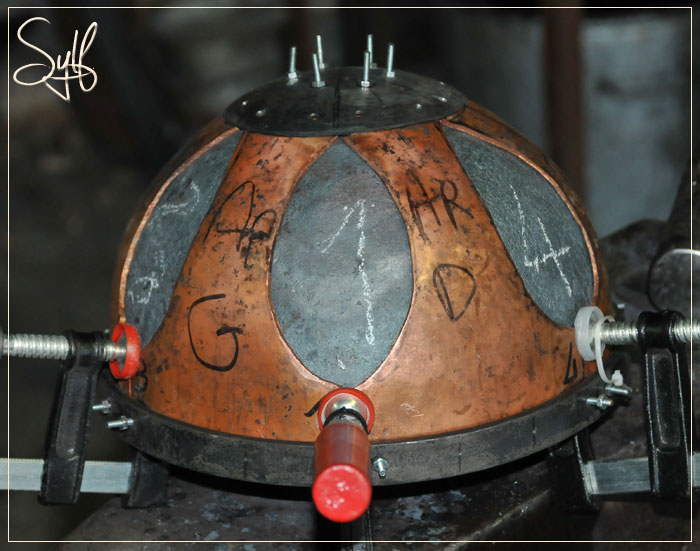 Puis j'ajuste les courbures vers le haut, en essayant d'être le plus symétrique possible et je boulonne le sommet du casque afin de rigidifier tout l'ensemble. J'ai donc ma forme définitive, je vais pouvoir commencer à donner les courbes à mes triangles de damas... à bientôt !