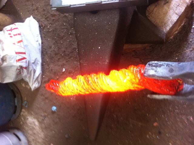 Et voilà, les vacances sont finies, j'ai remis la forge en route cet après-midi pour commencer à former les lopins de damas câble qui me serviront à réaliser une lame de katana (enfin si toutefois la culture nipponne me permet de la nommer ainsi car la méthode n'est pas du tout traditionnelle).