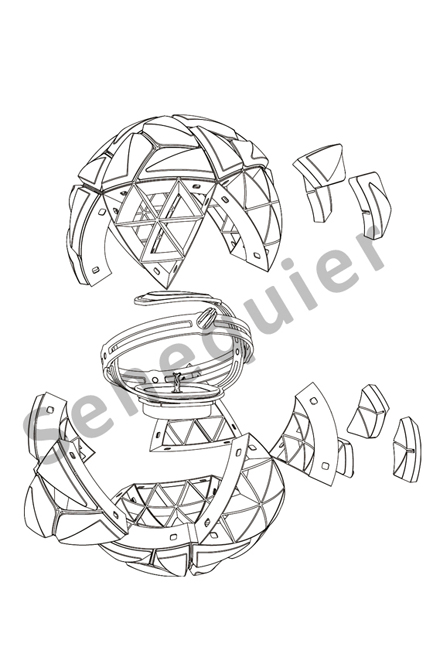 L’objet est une sphère composée d’une résille structurelle dans laquelle s’articule un gyroscope. Plusieurs maquettes de principe ont été réalisées dont une en impression 3D pour valider toutes difficultés techniques.