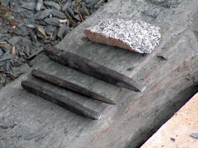 Marie-Paule, Nicolas Carrier et Pierre Hanff préparent l'un des morceaux qui servira à créer des outils de tailleur de pierre.