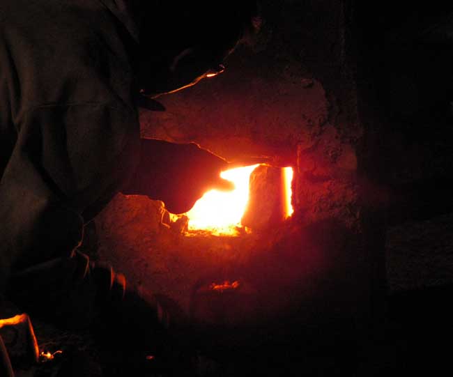 - Façade avant du bas - fourneau de type japonais (16ème siècle) en cours de finition. Les briques centrales émergentes seront les premières retirées pour permettre l'écoulement du laitier.