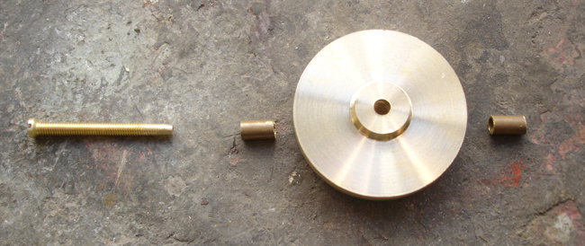 La grosse réparation a consisté à faire tourner un disque de bronze, couper deux petits bouts de tube laiton, une vis laiton et un filetage dans le trou de l'axe sur le bronze.