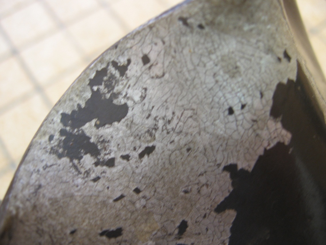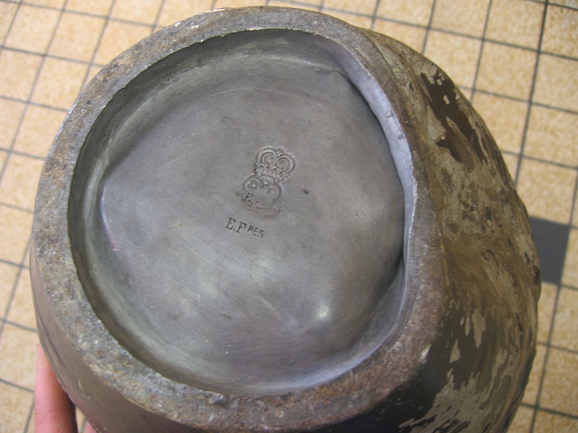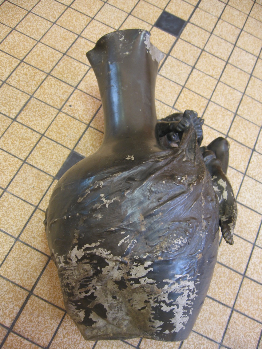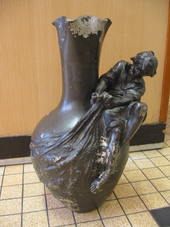 Voici en photo un vase du sculpteur Auguste Moreau dont la peinture noire sur étain s'écaille, et qui a pris quelques chocs :