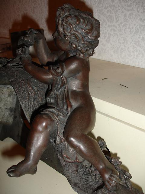 Il semble en bronze ou en régule de plomb? : couleur marron - satiné - très lourd. Il est soudé par endroits au rocher en régule.