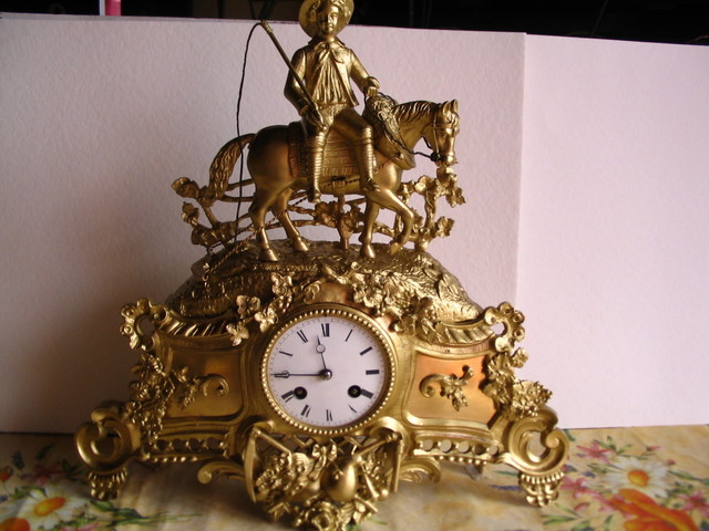 Donc finalement, j'ai mis celui dont je vous parlais hier et ça parait assez bien : pratiquement pas d'épaisseur. J'ai essayé de refaire la même teinte et ce n'est pas trop mal. La teinte est plus claire que mon autre pendule et pourtant c'est identique au cheval qui n'avait pratiquement pas souffert. Je me pose donc une question : cela serait-il possible que c'était laitonné et non doré ou existe-t-il des pendules qui sont dorées clair, un peu comme du laiton ? En regardant les photos sur le PC avant nettoyage, ça paraît bien imité. Il ne me reste plus qu'à remonter l'ensemble. A +.