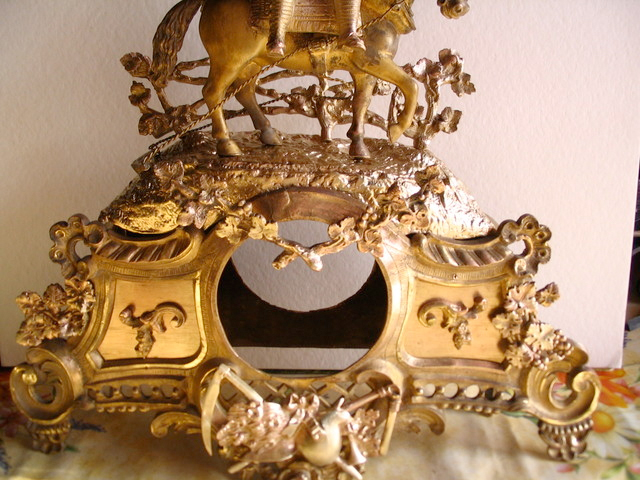 Malheureusement ce produit contient de l'acide qui a enlevé la partie se trouvant dessus. La partie qui a le plus souffert fait apparaître du cuivre. J'en conclus que l'ensemble des pièces, qui sont en bronze, sont cuivrées avant d'être recouvertes de la couche de finition, de l'or très probablement. Ca fait comme les pièces en acier qui sont chromées sur cuivre. En toilant les parties cuivrées ainsi apparues par endroit, le bronze apparait à son tour.