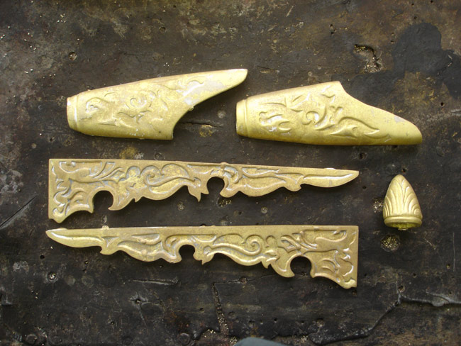 Ensuite je les ai ébarbées. Les deux moitiés de l'ornement de lame seront rendues à Bernard afin qu'il perfectionne l'ajustage sur la lame, elles me seront ensuite restituées afin que je les soude.