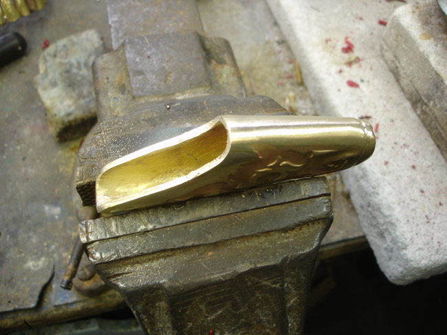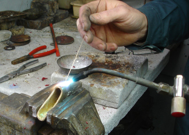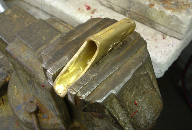 Les deux moitiés de l'extrémité du fourreau peuvent être soudées ; il sera plus facile d'ajuster le bois du fourreau. Pour ce faire, je redresse les deux pièces qui ont légèrement gauchi à la fonte. Elles sont ensuite positionnées et brasées à l'argent.