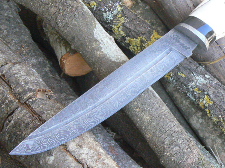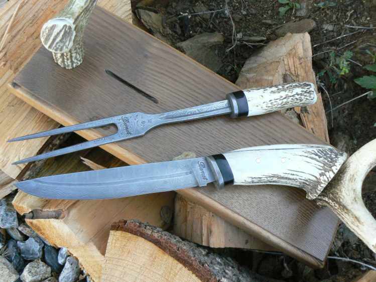 Voici un service à viande dont les matériaux m'ont été offerts par deux amis, Christophe Oge pour le damas et DanielC pour les bois de cerf.
