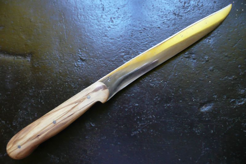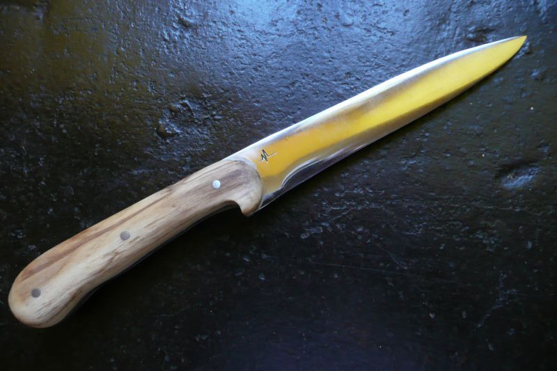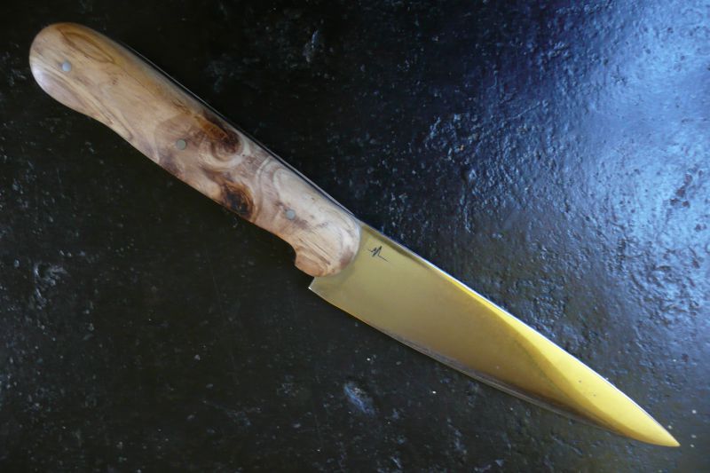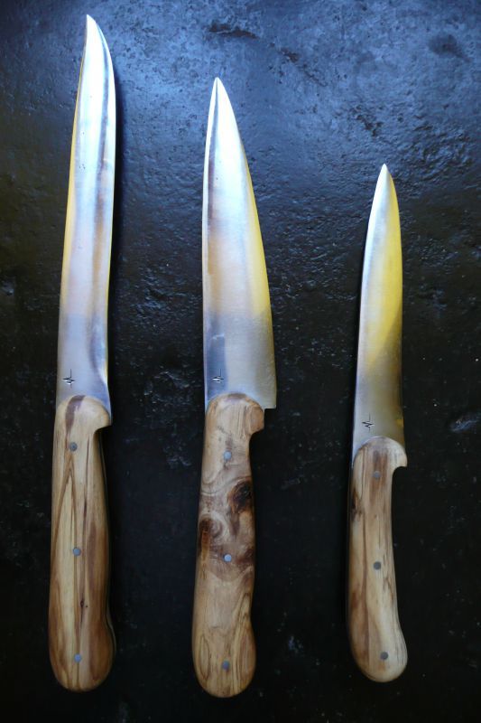 Comme vous avez été nombreux à réagir à propos de mon précédent couteau, j'ai décidé de réaliser un set de trois couteaux de cuisine inspirés du précédent, avec le même bois, même branche. Il s'agit d'un couteau à effiler, d'un éminceur, et d'un office.