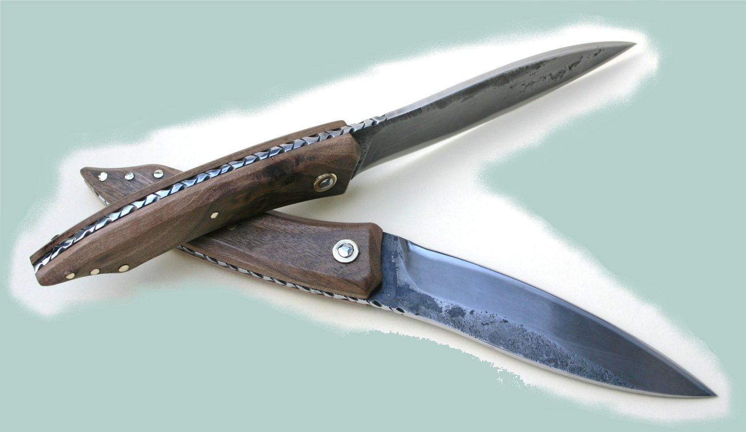 Les lames sont guillochées sur le dos et montées en plate semelle sur des manches en noyer.