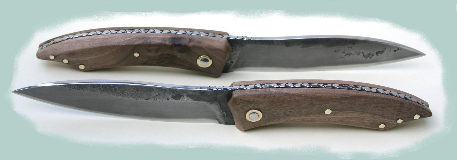 Il y a des défauts qu'on ne voit pas sur les photos mais au niveau des rivets, il y a quelques coups de marteau disgracieux sur le bois, je n'ai pas réussi à les éviter :-( ... Bien sûr, ça se voit lorsqu'on regarde les manches sous certains angles.