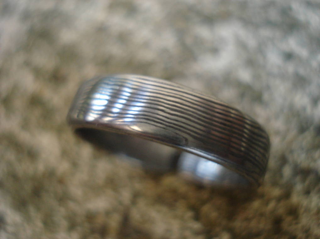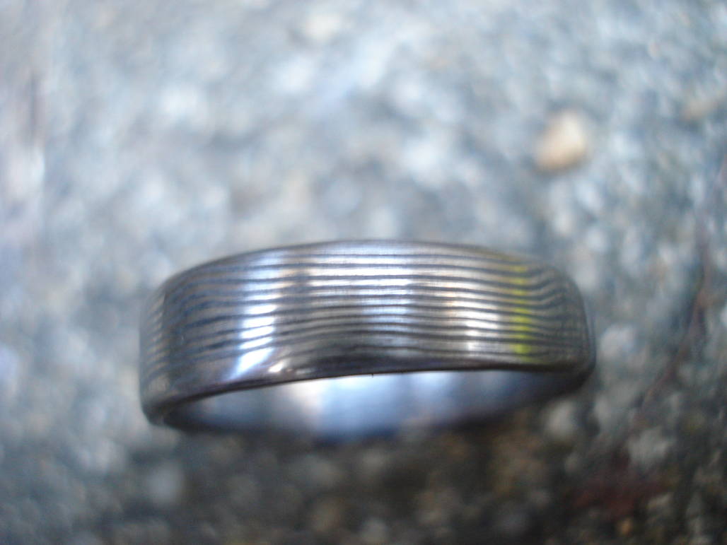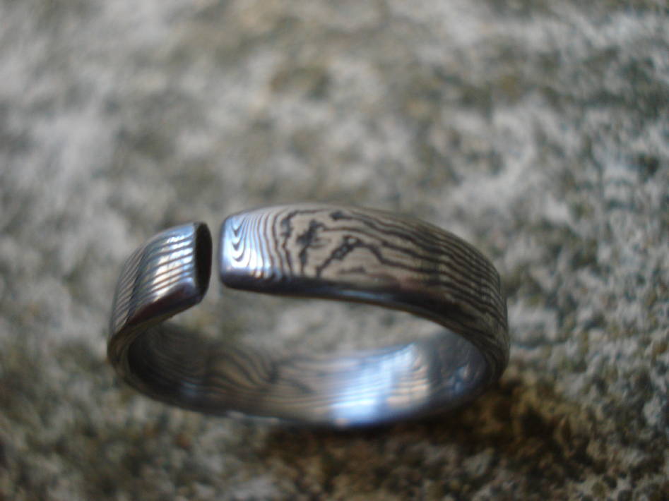 Vous savez que j'aime bien faire des bijoux avec des chutes de matériaux. Le damasteel (damas inox suédois) n'est pas un matériau que j'utilise pour faire mes lames car je n'ai pas la possibilité de le traiter moi-même de manière optimale. Par contre en bijouterie, je peux m'en servir. Un ami m'a donné des chutes de découpe de lame que je reforge et plie sauvagement autour de douille pour clé dynamométrique (et oui la bijouterie, chez moi, c'est de la mécanique), en chauffant au chalumeau propane.