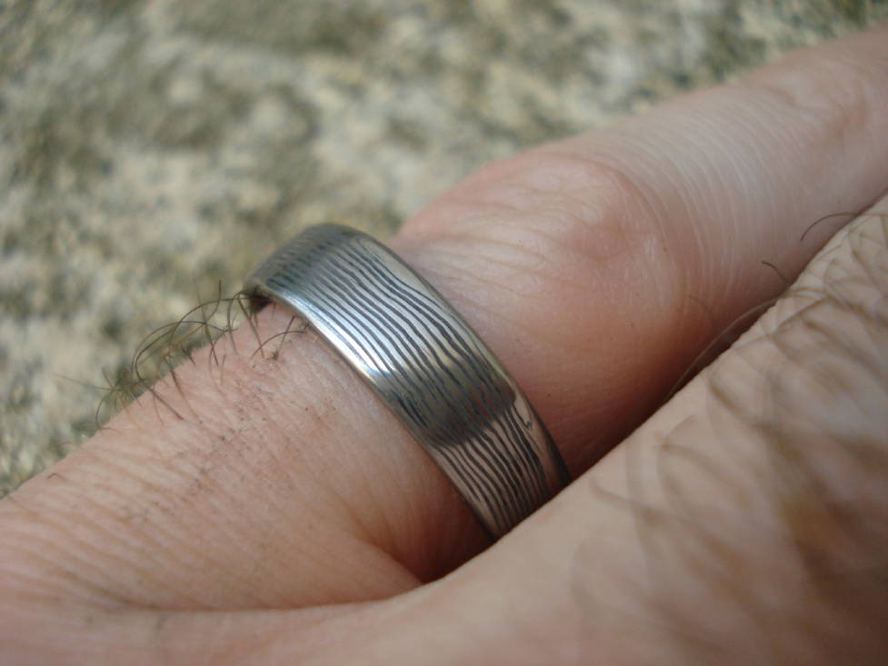 Cela donne une bague non fermée (car je n'ai pas le moyen de faire un point de soudure pour fermer l'anneau.), de taille entre 17.8 et 18.2mm. La finition satinée est réalisée à la bande scotch brite, deux révélations sont faites à l'acide sulfurique pendant 40 mn ; passage à la frotte après la première, et passage à l'abrasif 2000 pour bien garder le contraste de la révélation lors du second bain.